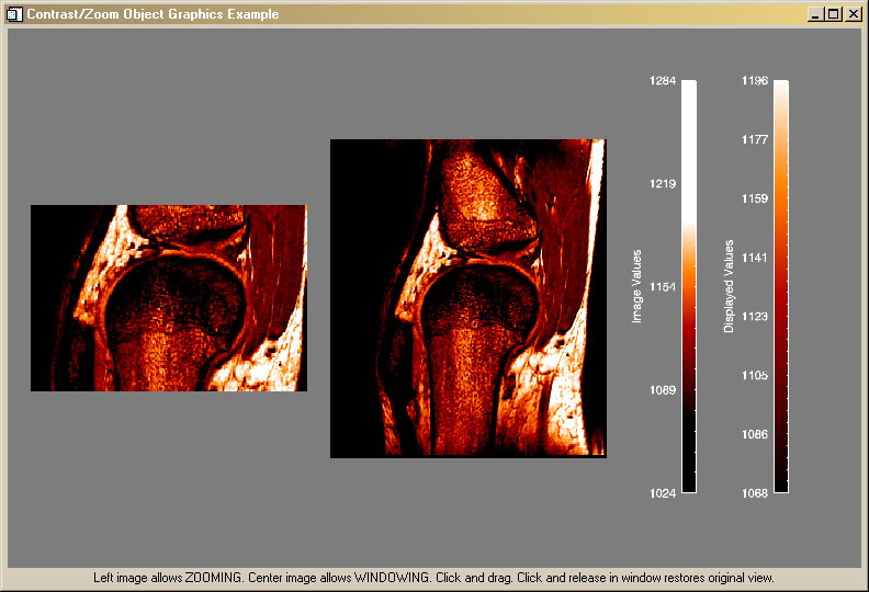 In the ContrastZoom program, I start off with a contrast value of 25 and a brightness value of 75. You can change the brightness values in the center image by dragging the cursor on the image in a horizontal direction. You can change the contrast values by dragging the cursor in a vertical direction. Of course, you can simultaneously change both brightness and contrast by moving the cursor on any diagonal direction. Two color bars have been added so you can observe the windowing and level effect as you move the cursor. The second color bar (farthest right) is a subset of the first, and shows you the extent of the displayMin and displayMax variables, which are discussed below. The image at the left in the program can be zoomed into by dragging a rubberband box around the area of the image you wish to see more clearly. You can restore the starting values in either image by simply clicking and releasing the cursor inside the image window. You can see what the program looks like in the figure below.